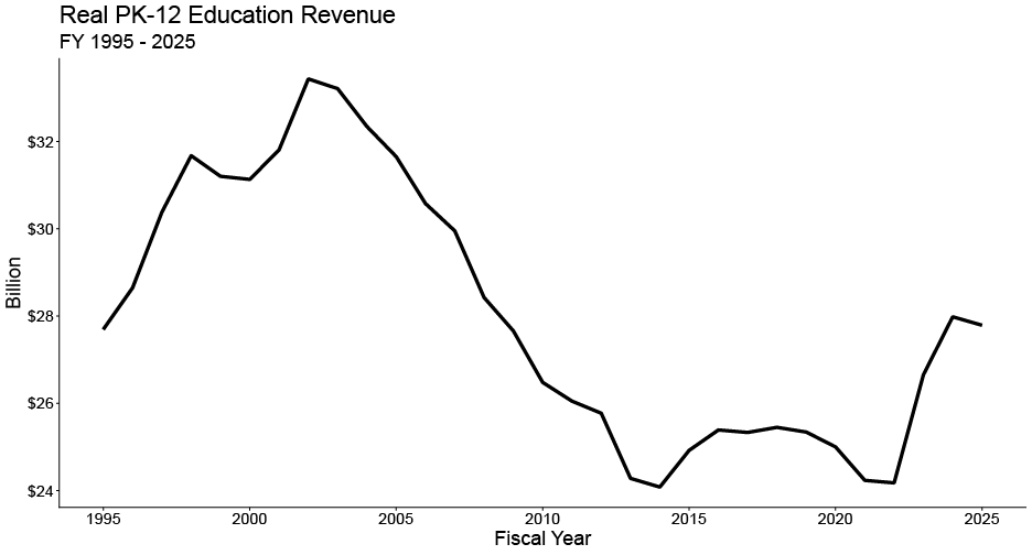 Feb. 2026: When it comes to analyzing improvement in Michigan school funding, a lot depends on when you start looking. Why start in 2012, for example? The answer is simple: when compared to bottomed-out K-12 spending in that year, gains since then look unprecedented. But further pulling back the curtain from 2012 to 2002 reveals the true trendline.