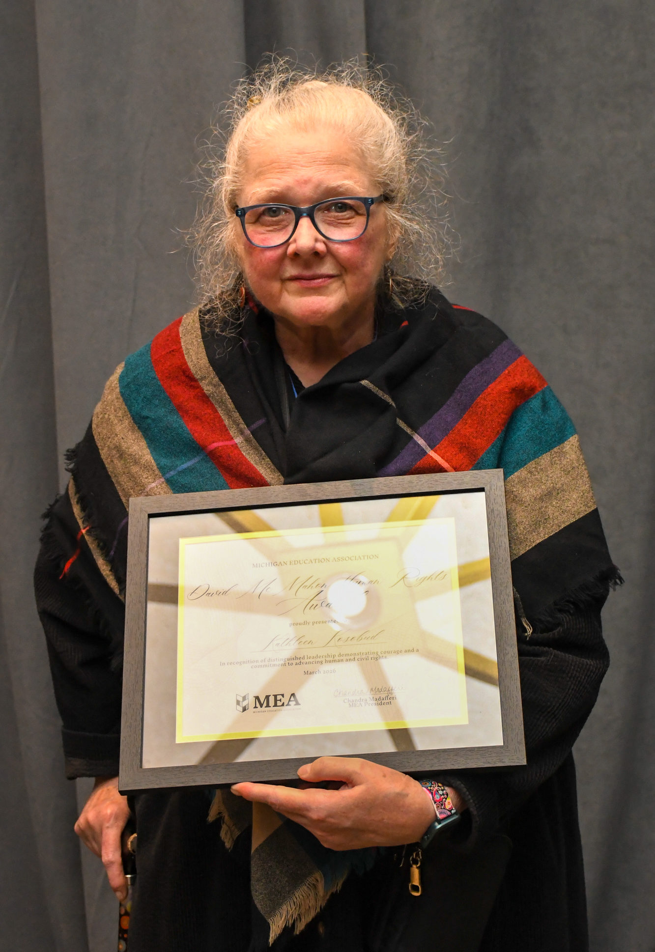 For lifelong commitment, Kosobud received MEA’s 2026 David McMahon Human Rights Award. Starting with a letter to the editor as a high schooler in 1968, up to recent work supporting transgender youth, she never wavered, said presenter Barb Schram, president of MEA-Retired.